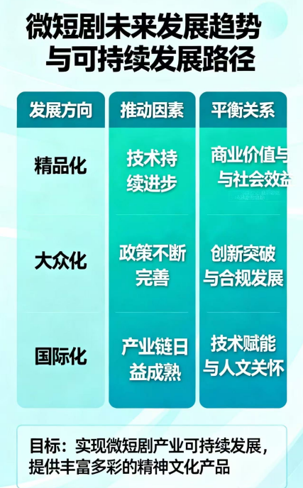 这一发展过程中,需要平衡好商业价值与社会效益、创新突破与合规发展、技术赋能与人文关怀等多重关系,才能真正实现微短剧产业的可持续发展,为观众提供更加丰富多彩的精神文化产品。