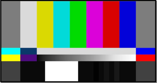除了以上三种评测方式以外,对于高清监视器的显示状态进行现场调整时,基本遵循的是美国电影电视工程师协会制定并发布的标准测试信号(简称SMPTE测试彩条),对监视器进行校准。专业高清摄像机的菜单中,都具备测试彩条发出功能。通过彩色测试信号,检查和调整监视器的亮度和对比度(见图 1)。