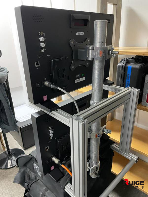 先来看看它的上层,一根中空的钢管,从中间穿过,通过自制的支架与监视器背部的VESA安装孔进行螺丝固定,两台监视器一上一下被非常稳固的固定在拍摄车架框上。