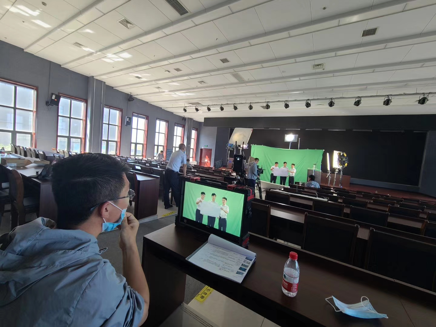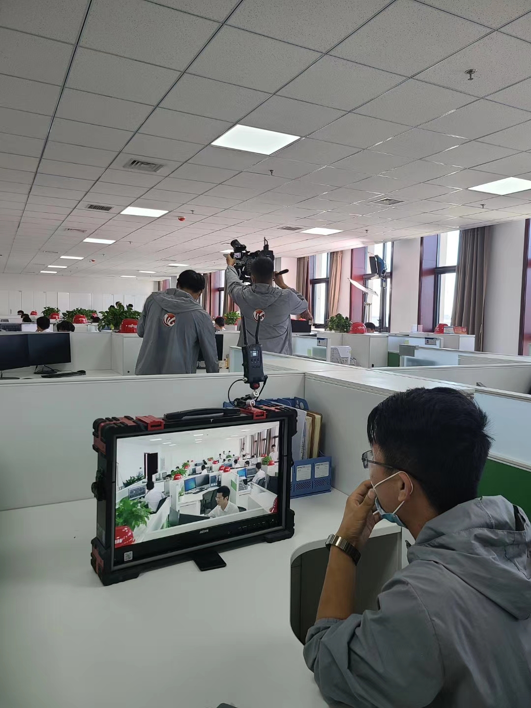 接下来,拍摄组来到了会议室进行取景拍摄。因为现场空间有限,导演选择坐在会议室的后排。虽然距离较远,但是通过固定在铠甲一号顶部的无线图传设备,丝毫不影响导演对现场拍摄画面的监看。