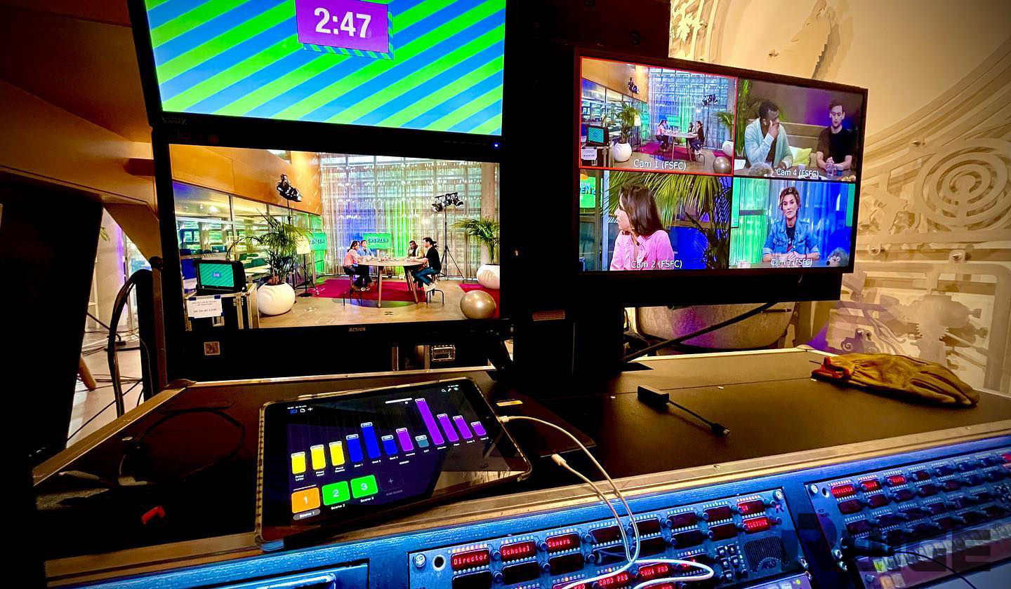 来到直播间的幕后,看到繁忙的景象,一切变得豁然开朗。只见众多的工作人员正在为节目直播忙碌着,有的一边盯着巨屏显示器一边通过无线麦克风给主持人提示;有的通过直播后台处理着网友的提问;有的通过监看瑞鸽的大屏桌面型监视器操控着导播台,控制网络直播摄像机,随时切换直播画面。分工明确,合作默契。