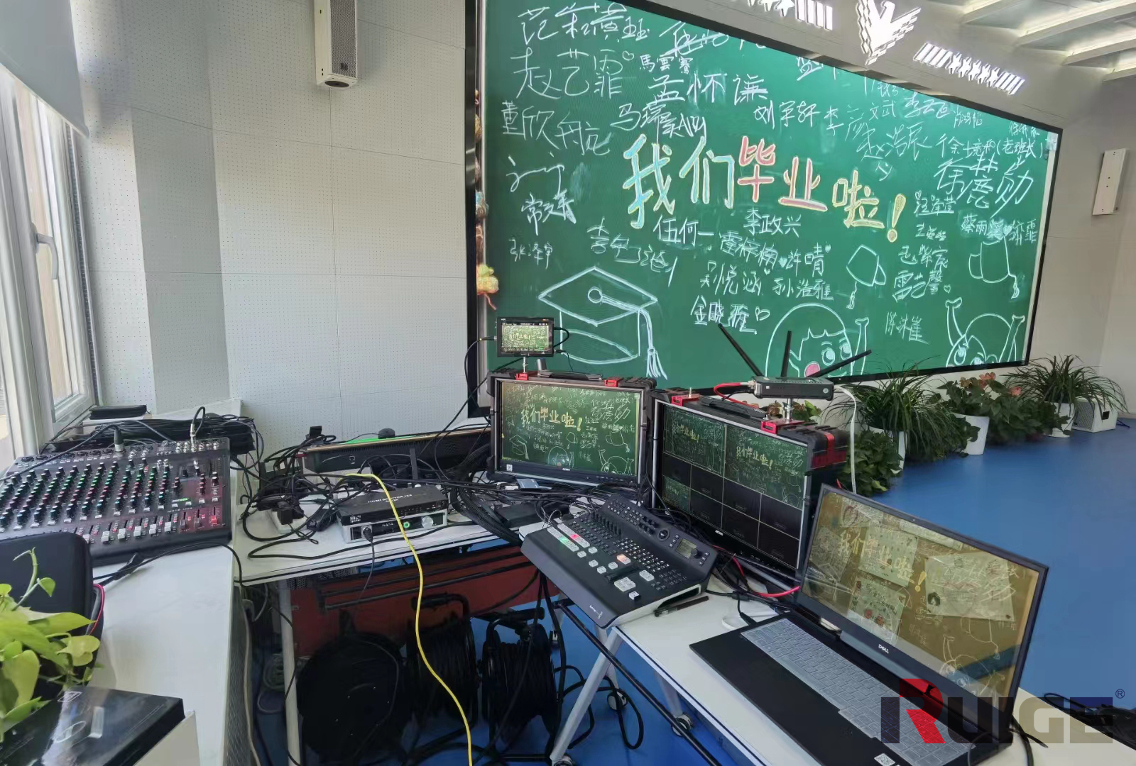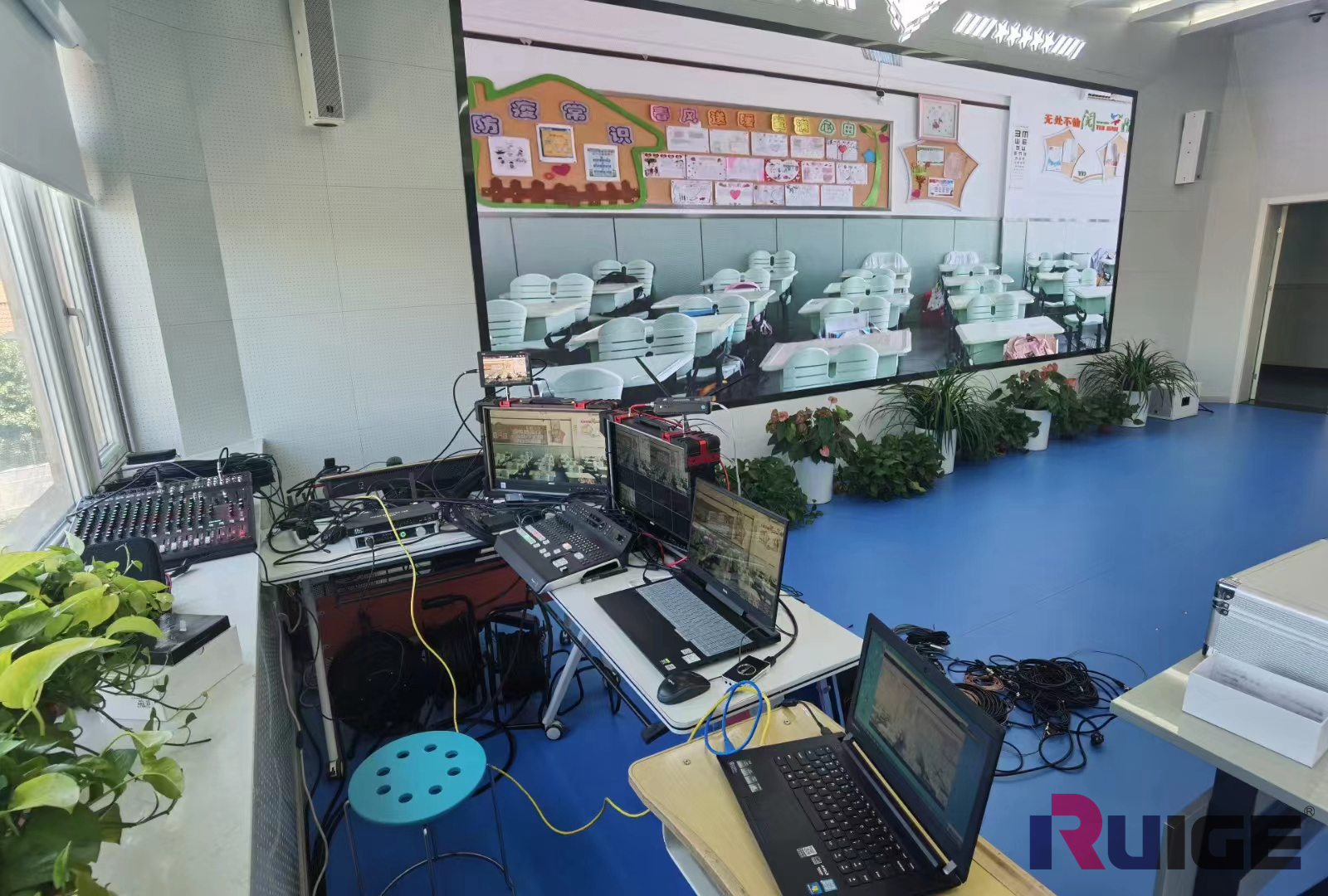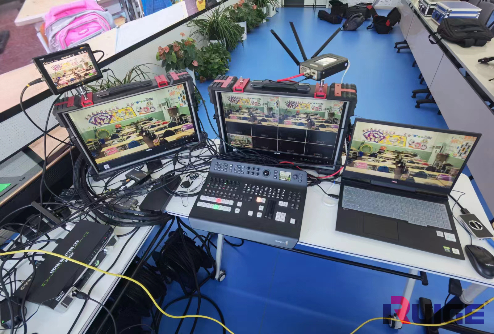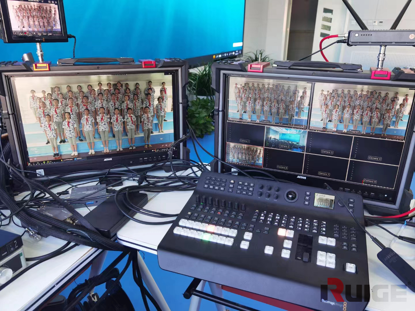 现场的拍摄人员已经将设备安装调试到位,开始取景拍摄。虽然只是给小学生拍摄,但是拍摄团队也没有丝毫马虎。选用了非常专业的拍摄器材。包括铠甲一号监视器、机头小监、无线图传、HDMI分屏器、导播台、音频调音切换台等等。