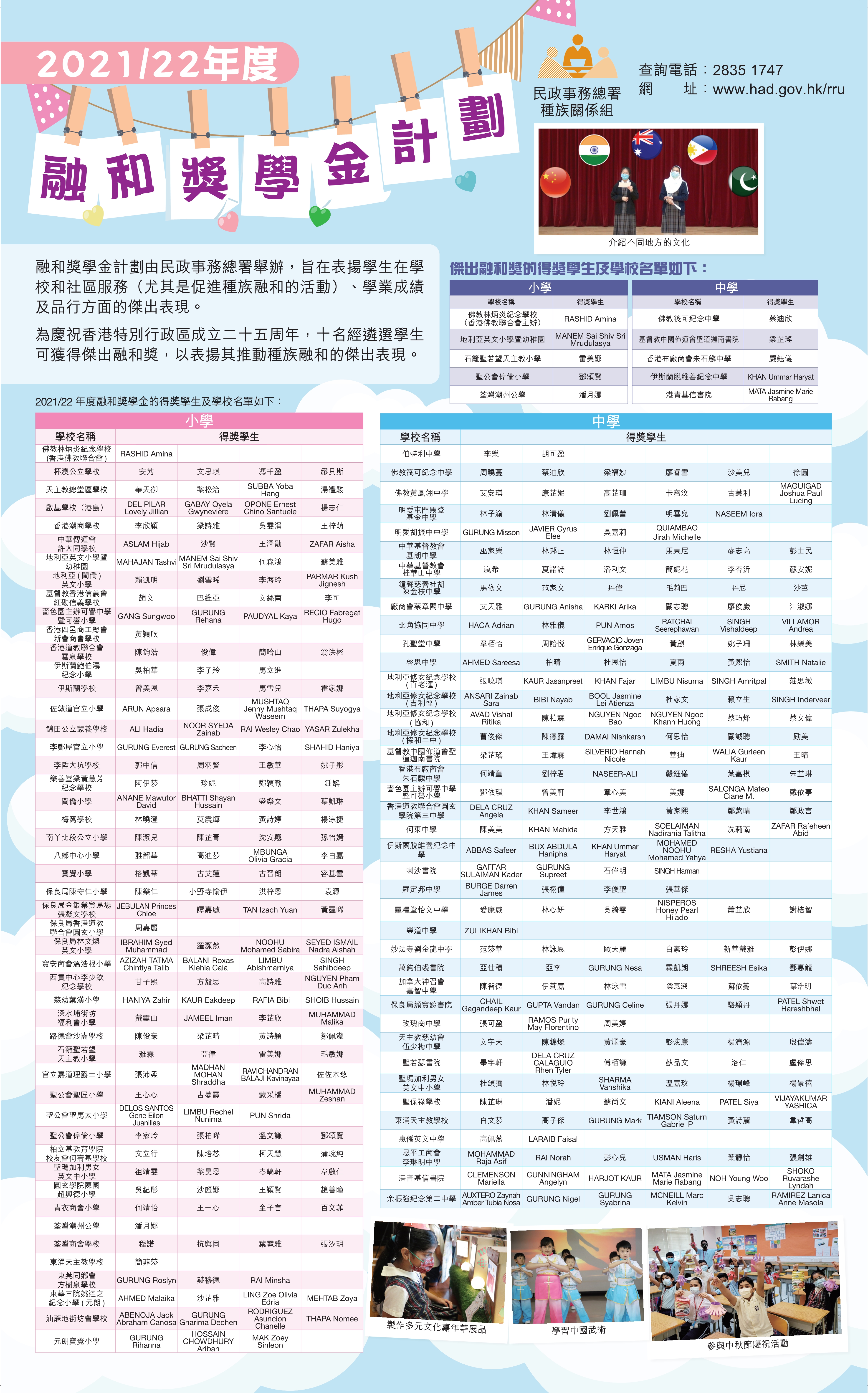 2021~22年度融和奖学金颁奖典礼于2022年8月份举行,颁发的奖学金共有三百九十三项。得奖者来自八十九间学校,包括一百七十七位来自四十九间小学的学生,以及二百一十六位来自四十间中学的学生。同时为庆祝香港特别行政区成立二十五周年,十名经遴选学生还获得了杰出融和奖,以表扬其推动种族融和的杰出表现。