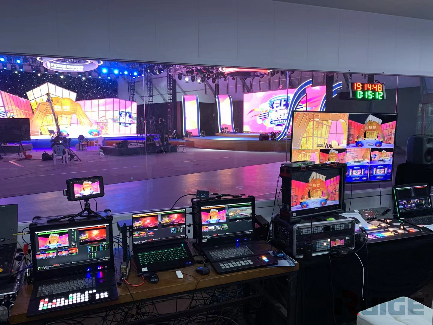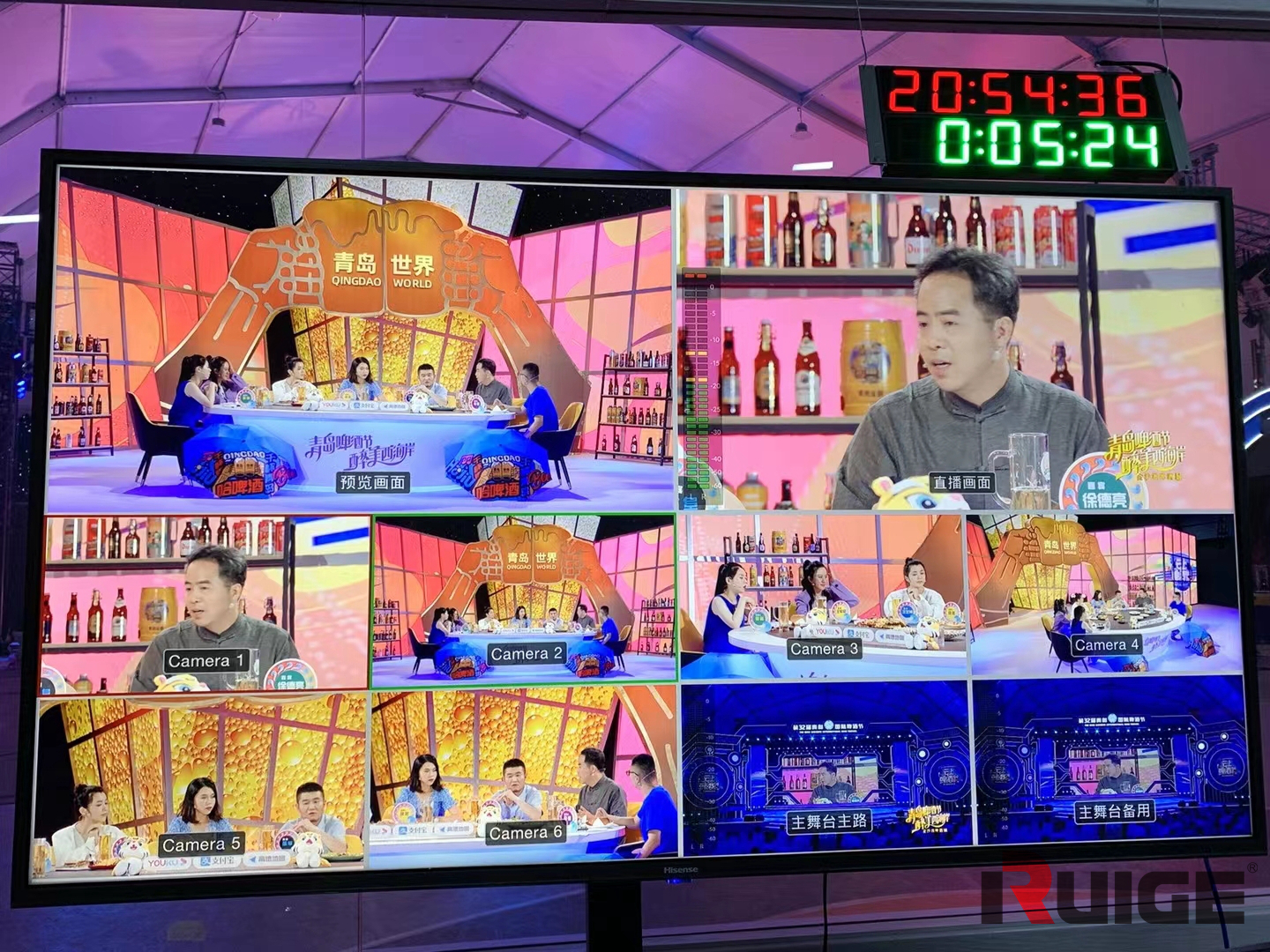 而这一切的顺利运行,当然离不开专业的直播间。为此主办方进行了精心的准备,直播现场布置得非常高端大气。而在直播间的幕后,各种专业的直播设备也在为直播的顺利进行保驾护航。包括导播台、音频切换台、大尺寸铠甲一号监视器、机头小监等等。