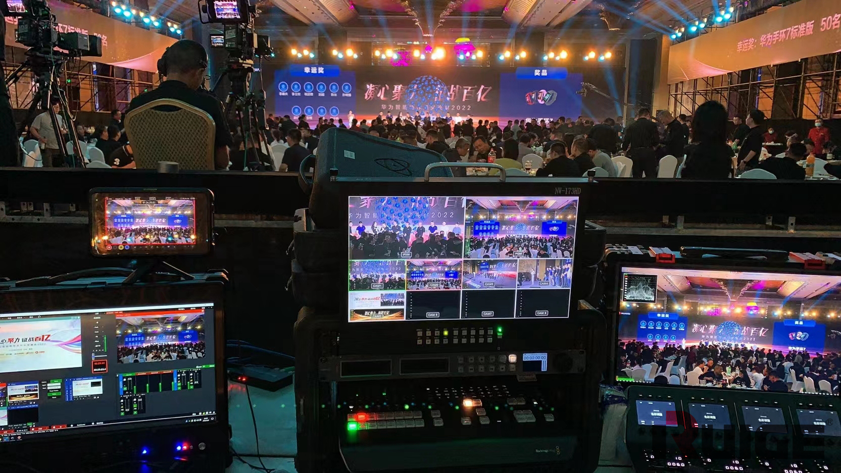 而负责此次直播的支持团队,正在会场的后排默默地为峰会直播的顺利进行提供着技术保障。通过三台大尺寸的铠甲一号专业监视器实时监看摄像机拍摄的画面,配合专业导播台设备的使用,让他们可以轻松应对现场的复杂情况。