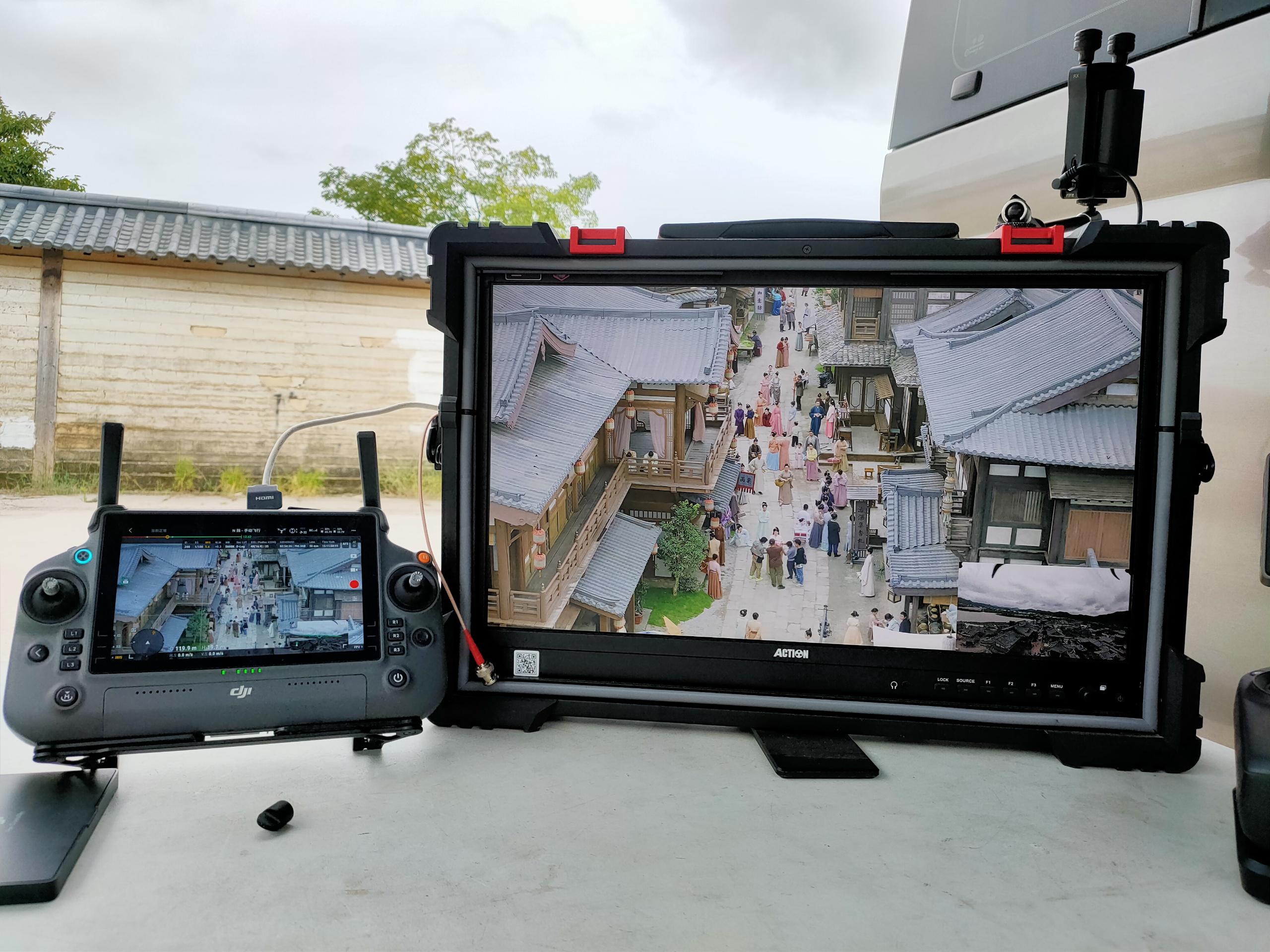 无人机轻盈地升空,它们如同鸟儿自由飞翔在古镇上空,从空中俯瞰着小镇的全貌。每一台无人机都配备了遥控器,遥控器上的彩色显示屏可以实时反馈拍摄的画面。然而,这还不够。飞手们为了更加精准地掌控画面,还配备了大尺寸的铠甲一号监视器。