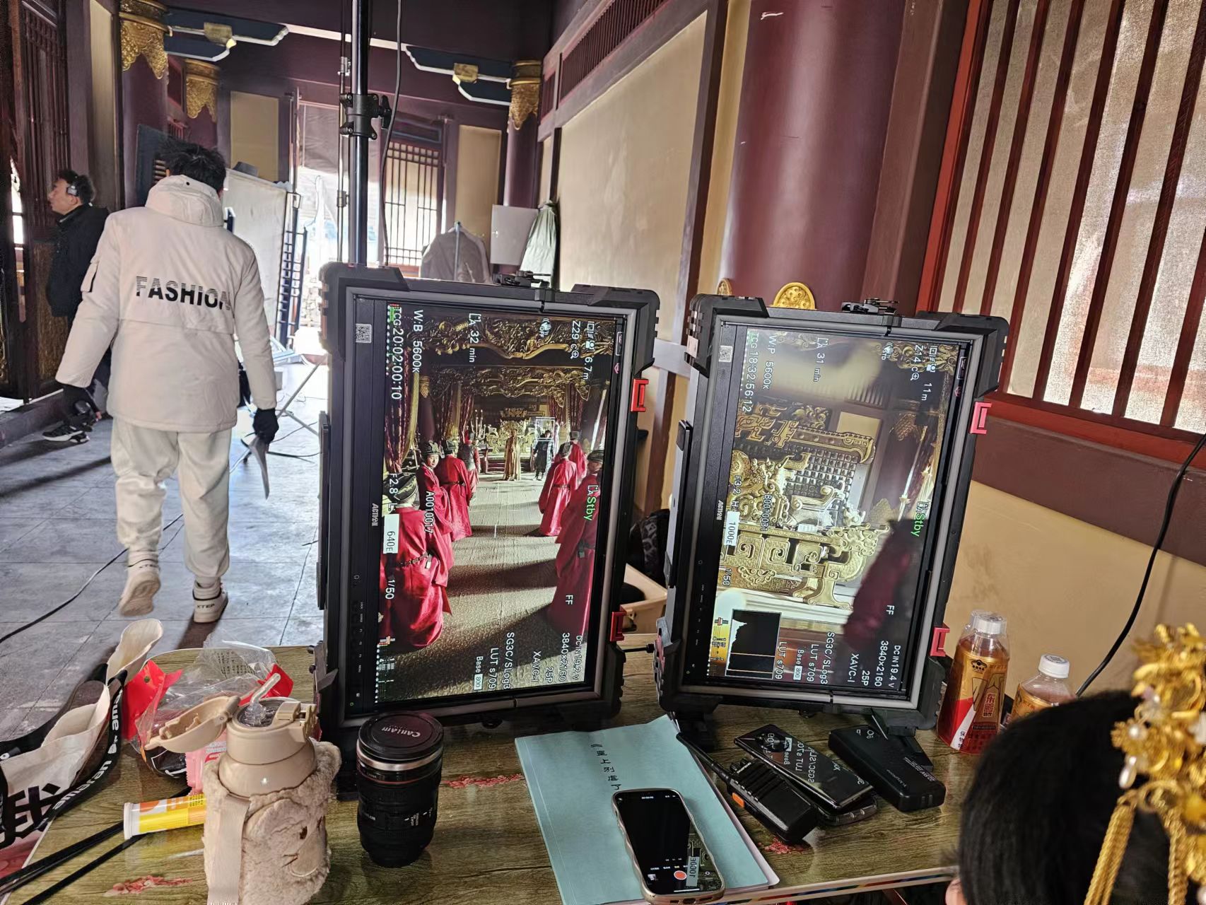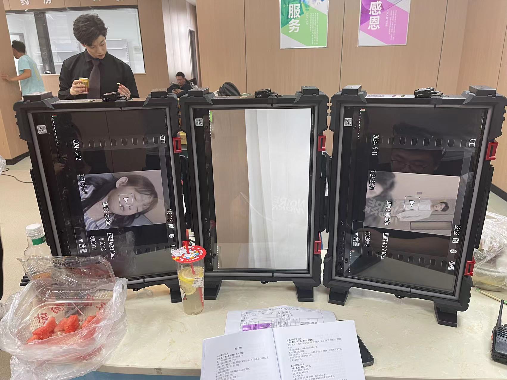 在实际应用中,三联竖屏监视器展示了它的巨大优势。例如,在下面的短剧拍摄中,一台三联竖屏监视器就同时显示了三个不同的机位画面。这种设置不仅方便导演实时监看不同的镜头,还能迅速做出调整,确保每个镜头的画面质量和构图都达到最佳效果。