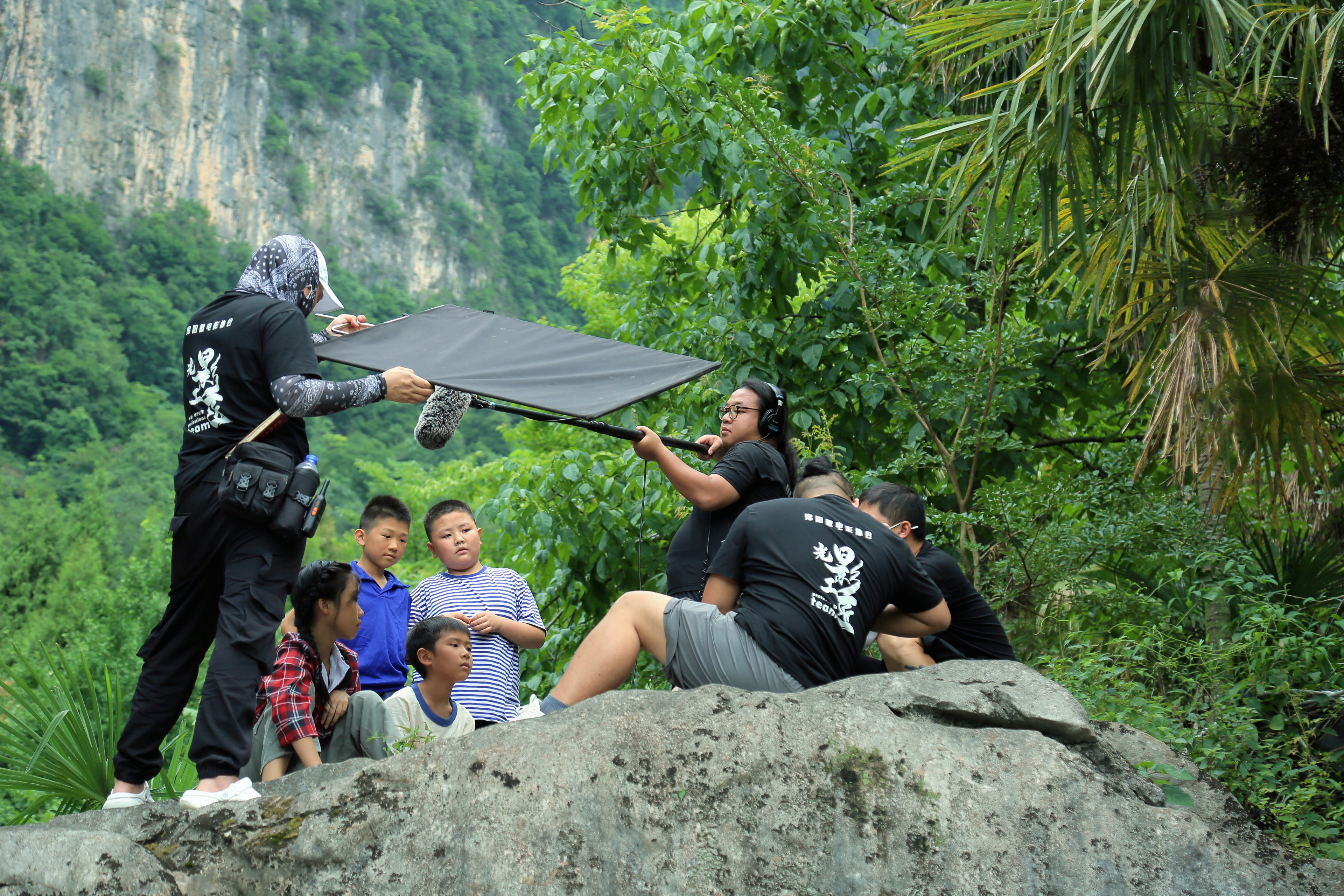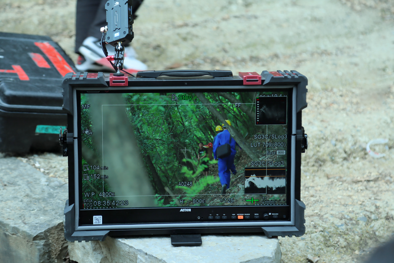 随着拍摄的深入,团队来到到更密集的森林中。在这里,密集的树林、崎岖的山路给拍摄带来了不少挑战。然而,铠甲一号坚固的外衣、便携的机身让这一切变得轻松应对。我们看到监视器被稳固地放置在一块石头上,导演正通过监视器来监看现场的布置情况。