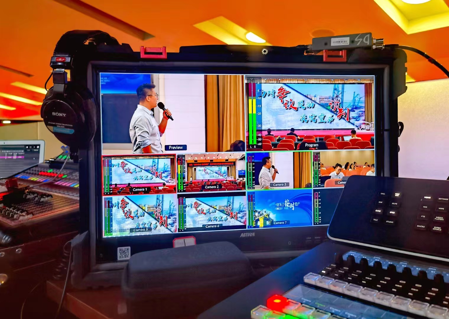 作为导演,我需要通过监视器来实时监看多个摄像机画面,同时进行画面切换。主屏幕上,一名正在演讲的人员侃侃而谈,其他小屏幕则展示着不同的会议场景。通过这些画面预览,我可以从不同角度捕捉活动的精彩瞬间,确保直播内容的丰富和多样。