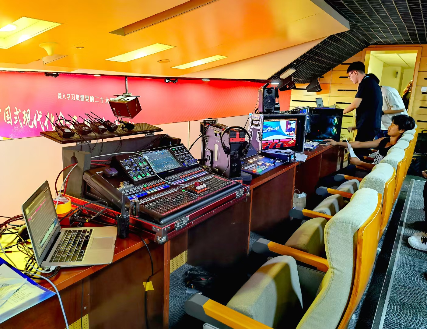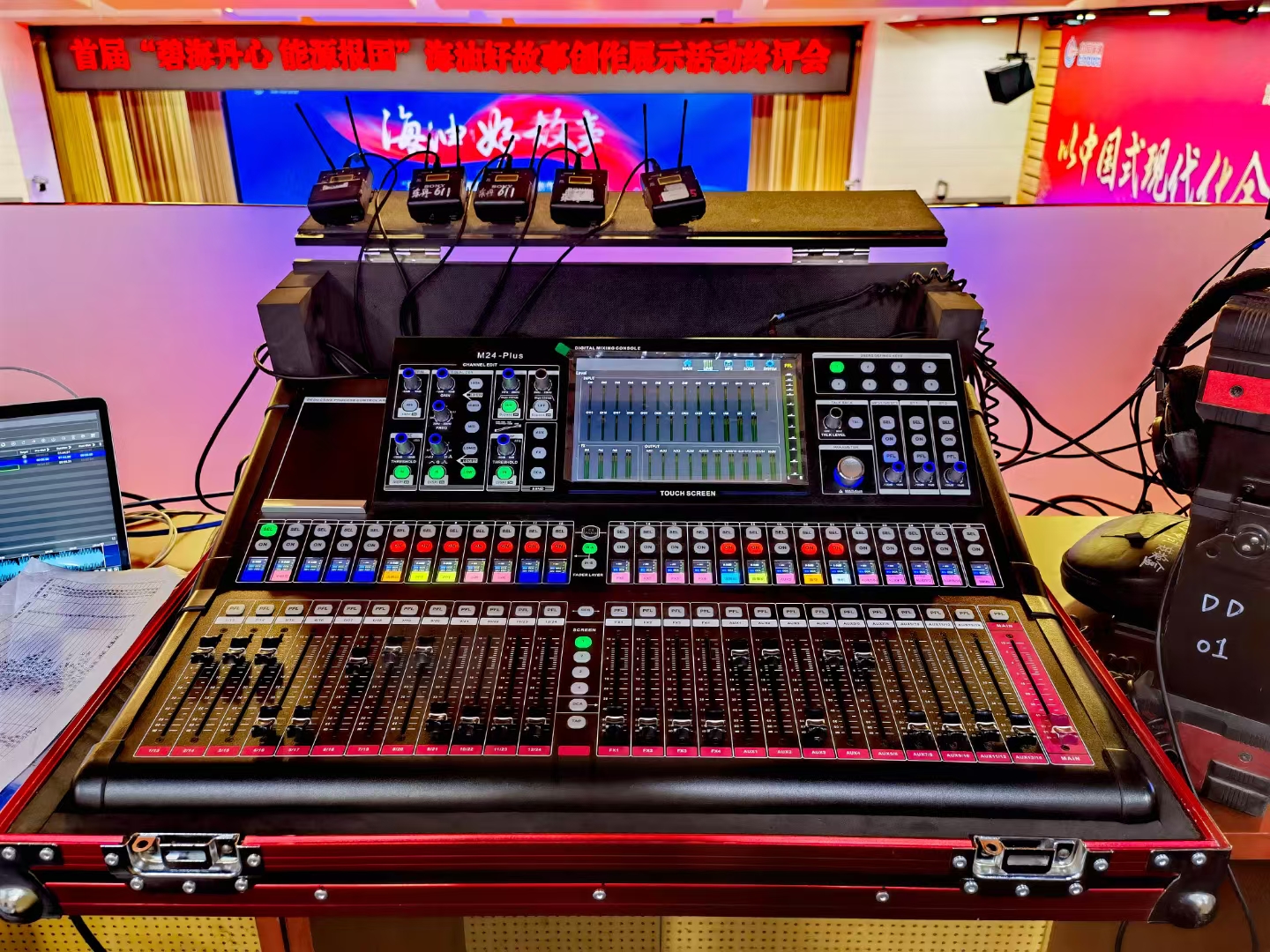 在音频控制台前,我的另一位得力助手正熟练地操作着各种按钮和调音滑块。调音台上方,多个无线接收器整齐排列,确保每一个麦克风信号的稳定接收。每一个音频信号都经过细致调试,确保声音清晰饱满,不出任何差错。