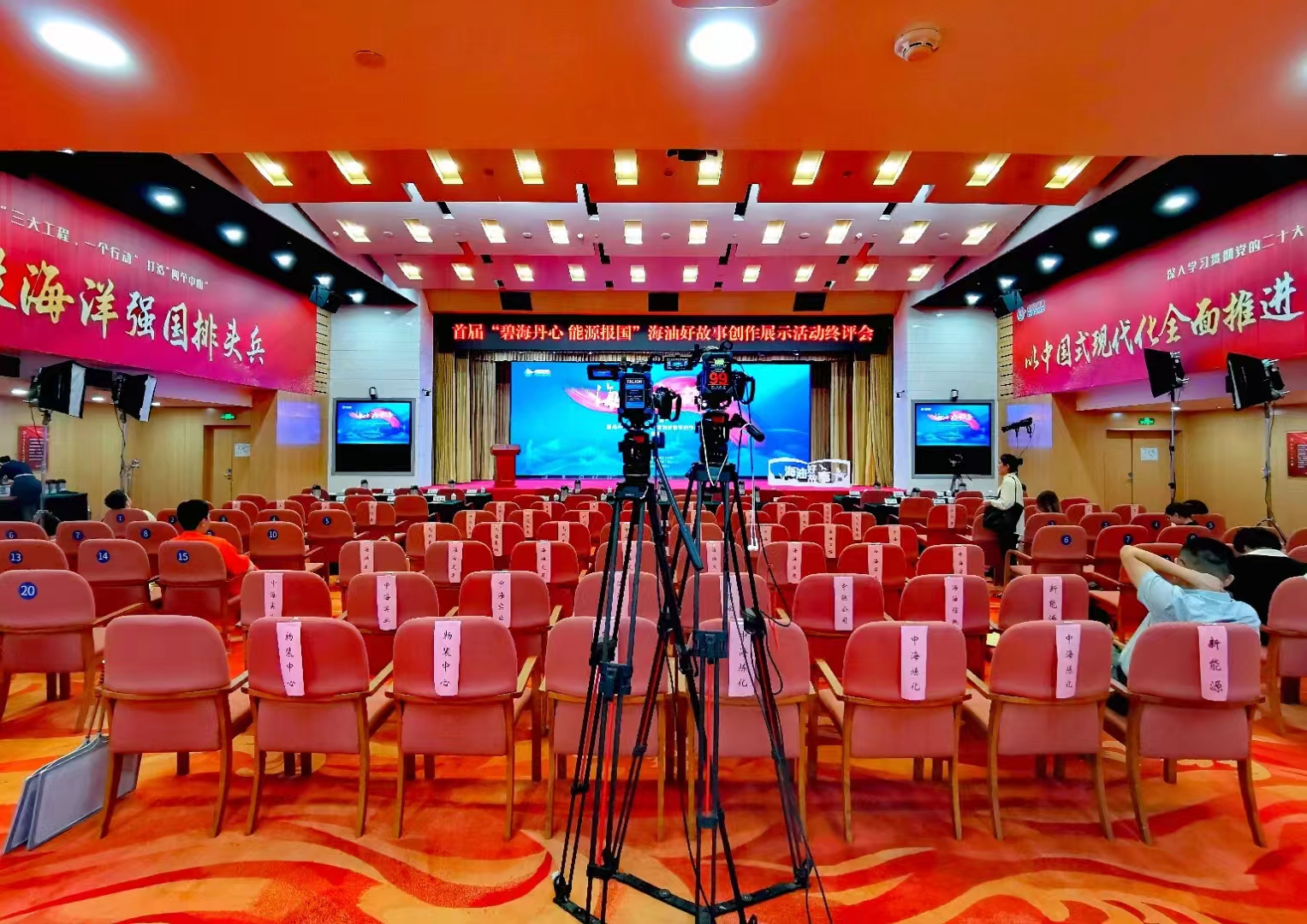 走出控制室,来到会议室。红色的座椅整齐排列,散发着热情与庄重的气息。前方的讲台显得格外引人注目,两台摄像机架设在讲台前,准备记录下每一个精彩的瞬间。屏幕上,活动的主题“海油好故事”赫然在目,四周悬挂的红色横幅标语,更是为活动增添了几分隆重。