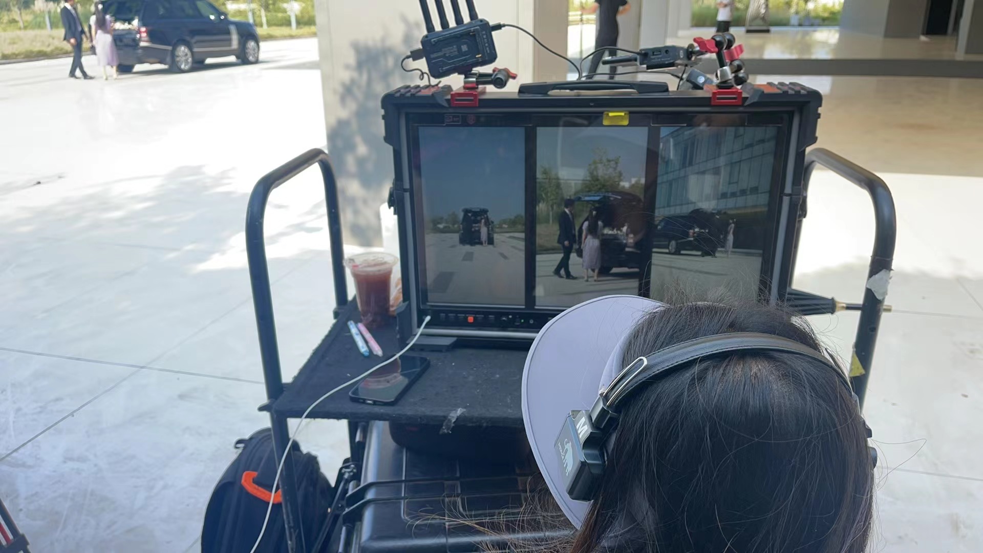 随着拍摄的进行,拍摄场景转到室外,虽然光照强烈,但导演仍然能够清晰地看到监视器中的画面。原来,这款三联监视器不仅能够显示竖屏画面,还支持高亮模式,尤其适用于外景拍摄,即使在强光环境下,画面依旧鲜明、细致。