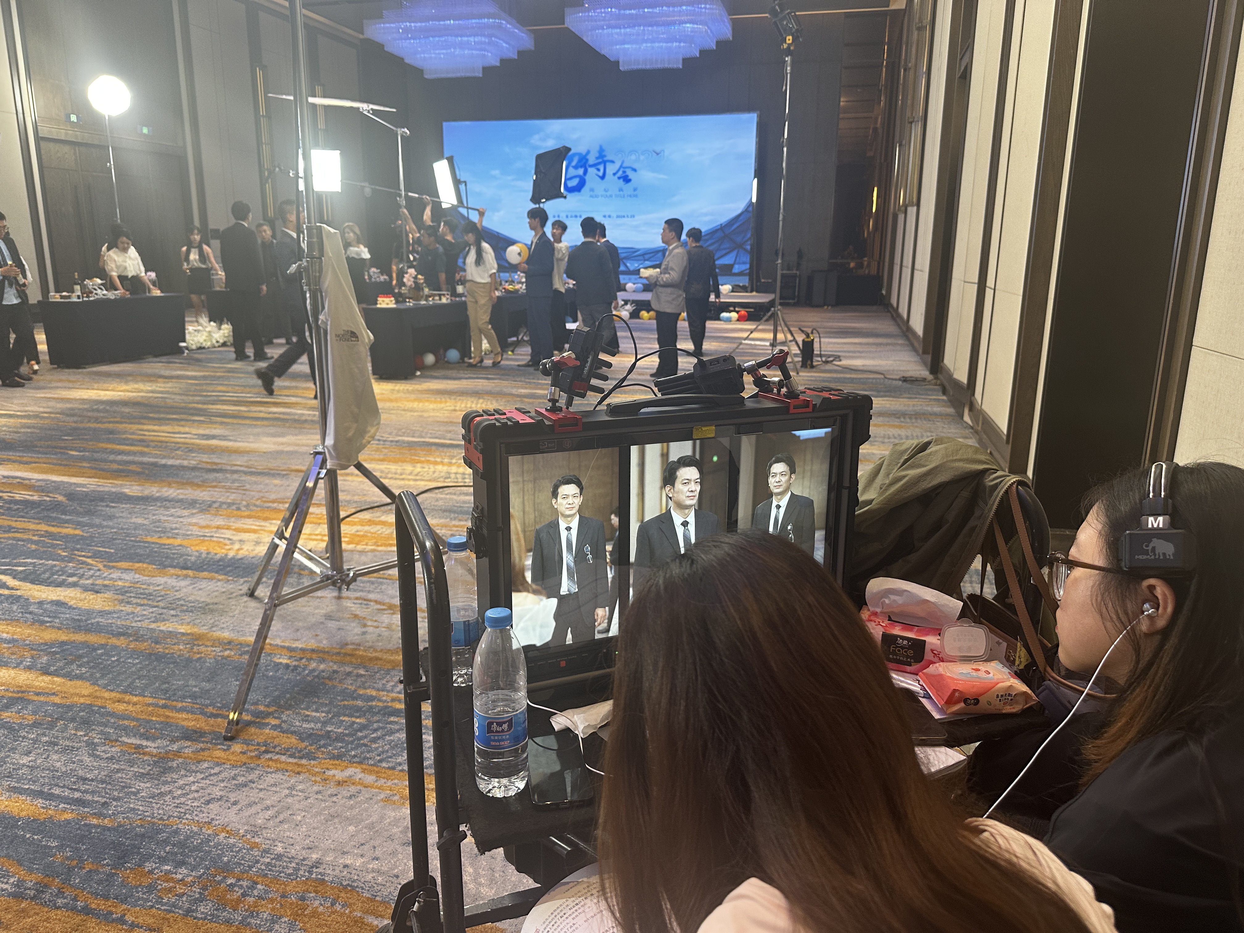 在一个宽敞的大厅内,剧组人员正在忙碌地布置着场地。作为一部竖屏短剧的拍摄现场,紧凑的拍摄计划和节奏让每个人都紧张又兴奋。导演站坐在一旁,正注视着演员们就位的场景,而一旁的工作人员正快速调整灯光与摄像机的角度。