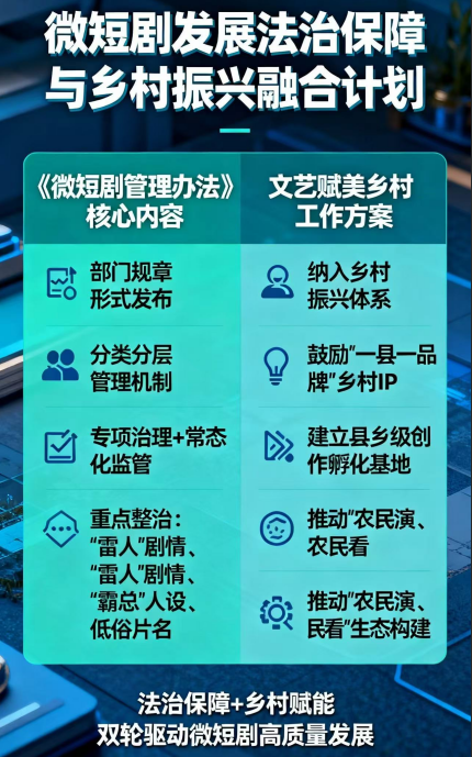 国家广电总局正在制订《微短剧管理办法》,计划以部门规章形式发布,通过建立分类分层管理机制、开展专项治理和常态化监管,重点整治"雷人"剧情、"霸总"人设、低俗片名等行业乱象,为微短剧发展提供法治保障。同步推进的"文艺赋美乡村"工作方案将微短剧纳入乡村振兴体系,鼓励打造"一县一品牌"乡村IP,建立县乡级创作孵化基地,推动"农民演、农民看"的生态构建。