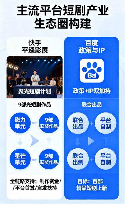 主流平台加速构建短剧产业生态圈。快手在平遥影展设立"聚光短剧计划",通过磁力与星芒双单元评选9部获奖作品,提供从制作资金、平台首发到宣发扶持的全链路支持。百度则创新"政策+IP双加持"模式,同步推进联合出品与平台自制,聚力实现百部精品短剧上新。